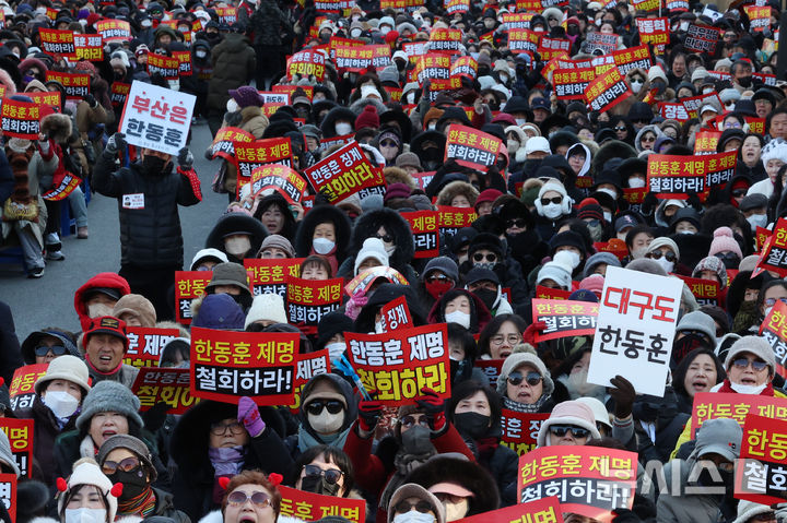 [서울=뉴시스]김진아 조성우 기자 = 한동훈 전 국민의힘 대표 지지자들이 24일 여의도에서 집회를 열고 한 전 대표에 대한 징계 철회를 요구했다.