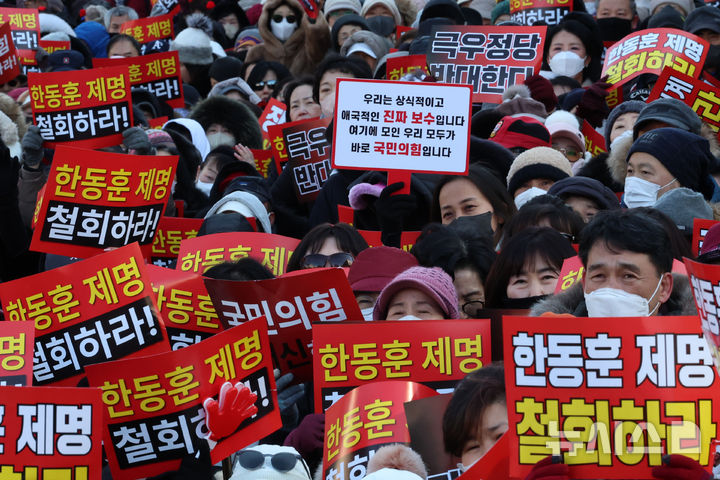이들은 ‘한동훈 제명 철회하라’ ‘국민의힘 해산하라’ ‘극우정당 반대한다’고 적힌 피켓을 들고 “한동훈 우리가 지킨다” “한동훈을 내친다면 (국민의힘) 지도부는 각오해라”고 구호를 외쳤다.