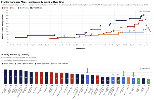 게시물에는 한국 ‘독자 AI 파운데이션 모델 프로젝트’도 언급됐다. AAII는 “한국 독파모 사업은 우수팀을 선별해 대규모 그래픽처리장치(GPU)와 직접적인 정부 재원을 지원하는 구조로 설계됐다”며 “2025년 8월 1차 선정에서 네이버와 SK텔레콤, LG, 업스테이지, NC AI 등 5곳이 뽑혔고, 최근 평가를 통해 LG, SK텔레콤, 업스테이지 3곳으로 압축됐다”고 설명했다.