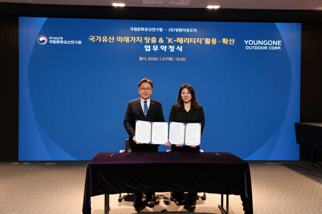 국가유산청 국립문화유산연구원(원장 임종덕)은 영원아웃도어(대표 성기학)와 K-헤리티지 활용·확산을 위한 업무약정(MOU)을 체결했다고 27일 밝혔다.