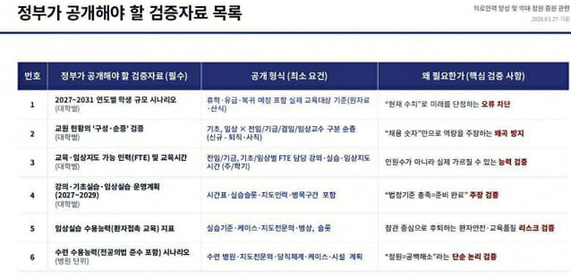 공개를 요구한 검증자료는 ▲대학별 2027-2031 연도별 학생 규모 시나리오 ▲대학별 교원 현황의 ‘구성‧순증’ 검증(대학별) ▲대학별 교육‧임상지도 가능 인력(FTE) 및 교육시간 ▲대학별 강의‧기초실습‧임상실습 운영계획(2027-2029) ▲임상실습 수용능력(환자접촉 교육) 지표 ▲병원 단위 수련 수용능력(전공의법 준수 포함) 시나리오 등이다.