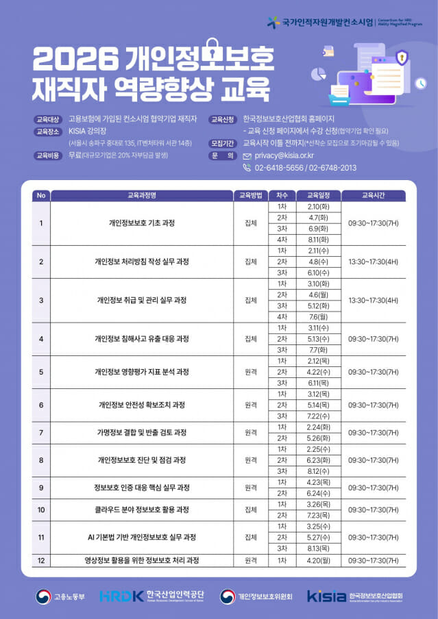 한국정보보호산업협회(KISIA)가 직업능력개발훈련 사업의 일환으로 기업 재직자를 대상으로 한 개인정보보호 관련 맞춤형 실무 교육을 개강한다.