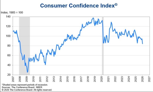 피터슨 수석 이코노미스트는 “현재 상황과 미래 상황 기대에 관한 소비자 우려가 모두 악화하면서 1월 들어 소비자 신뢰가 무너졌다”라고 분석했습니다.