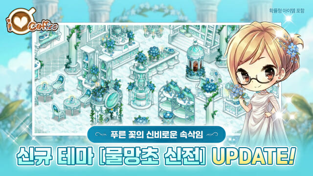 이번 업데이트의 핵심은 신규 인테리어 테마 ‘물망초 신전’이다. 연한 푸른 계열의 파스텔 톤을 포인트로 살린 감성적인 디자인을 전면에 내세웠다. 겨울의 고즈넉한 분위기와 물망초의 푸른 파스텔 계열 이미지가 조화롭게 어우러지는 것이 특징이다.
