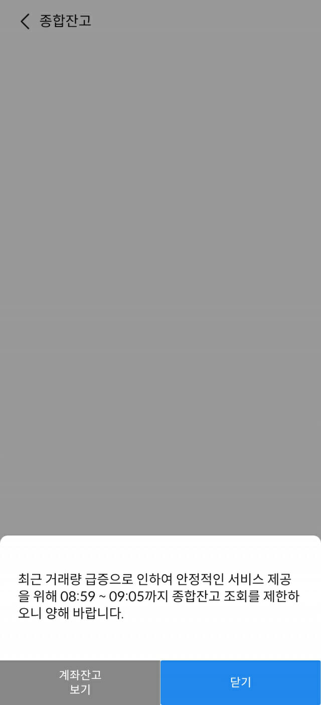 통상 투자자는 투자 직전 종합 잔고를 조회해 보유한 주식의 가치를 확인한 후, 매도와 매수 여부를 결정한다. 장 개장 직후 5분까지 종합 잔고 조회를 할 수 없는 상황이다.