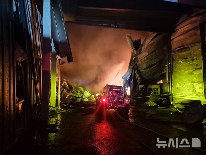 [음성=뉴시스] 연현철 서주영 기자 = 충북 음성 위생용품 공장 화재의 큰 불길이 잡히면서 연락이 두절된 직원에 대한 수색 작업이 진행되고 있다.