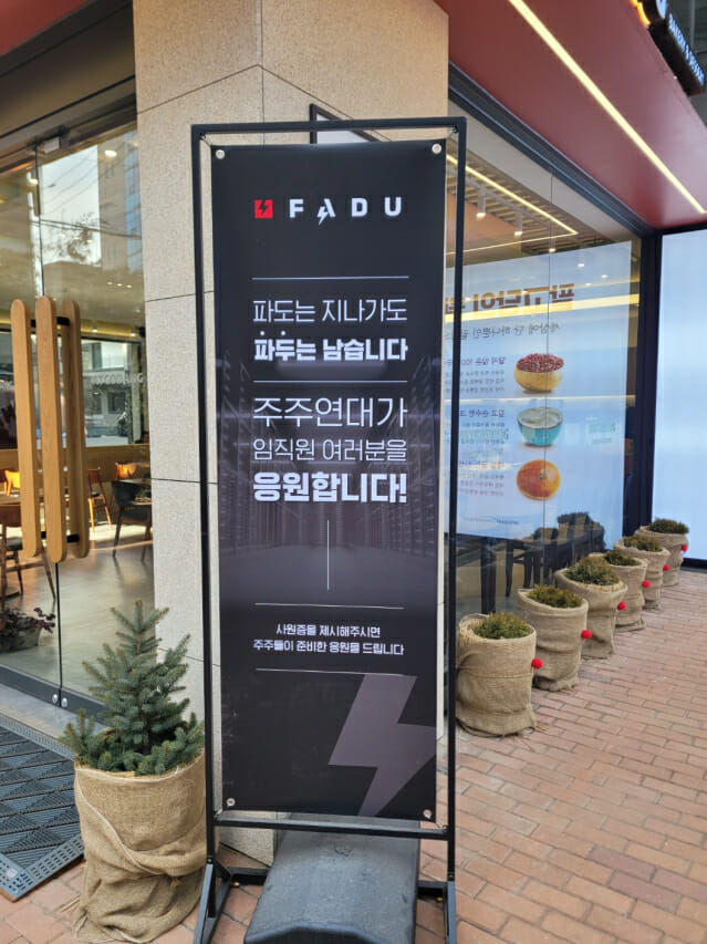 현장에는 “파도는 지나가도 파두는 남습니다. 주주연대가 임직원 여러분을 응원합니다.”라는 문구가 담긴 배너가 설치되어 임직원들을 맞이했다. 주주연대는 사원증을 제시하는 임직원들에게 주주들의 마음을 담은 간식을 전달하며, 기업의 기술력을 믿고 끝까지 연대하겠다는 뜻을 전했다.