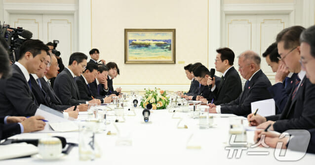 이날 이재명 대통령은 ‘청년 일자리와 지방 투자 확대’를 주제로 재계 간담회를 진행했다. 이재용 삼성전자 회장, 최창원 SK수펙스추구협의회 의장, 정의선 현대자동차그룹 회장, 구광모 LG그룹 회장을 비롯해 한화그룹·롯데그룹·포스코그룹·HD현대·GS그룹·한진그룹 총수 또는 경영진이 참석했다.