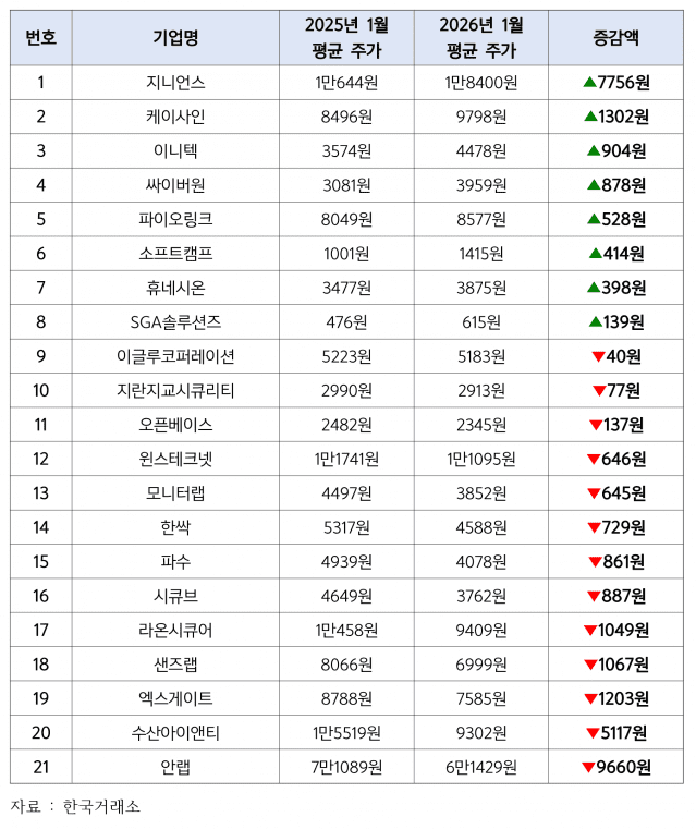 한편 이글루코퍼레이션과 지란지교시큐리티의 2025년 1월 대비 올해 1월 월 평균 주가가 각각 40원(-0.77%), 77원(-2.58%) 하락해 1년 동안 비슷한 수준을 유지한 것으로 나타났다. 오픈베이스는 지난해 1월 월 평균 주가가 2482원을 기록했으나 1년이 지난 시점인 올해 1월 기준 월 평균 주가가 2345원으로 137원(-5.52%) 소폭 하락했다.