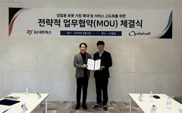 지능형 로봇 서비스 전문기업 클로봇은 종합 렌탈·서비스 기업 AJ네트웍스와 상업용 로봇 사업 확대 및 로봇 서비스 시장 활성화를 위한 업무협약(MOU)을 체결했다고 6일 밝혔다.