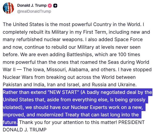 도널드 트럼프 미국 대통령 SNS 캡처(truthsocial)도널드 트럼프 미국 대통령은 종료된 미국과 러시아의 핵군축 협정인 신전략무기감축조약(New START·뉴스타트)을 연장하는 대신 새로운 조약이 필요하다고 밝혔습니다.