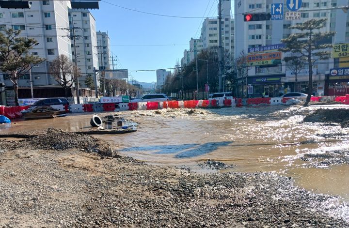 시 관계자는 “현재 2시간 넘게 응급복구 작업 중인데 복구 완료시점을 특정할 순 없다”라며 “상수관로 파손 경위 등도 조사 중”이라고 말했다.