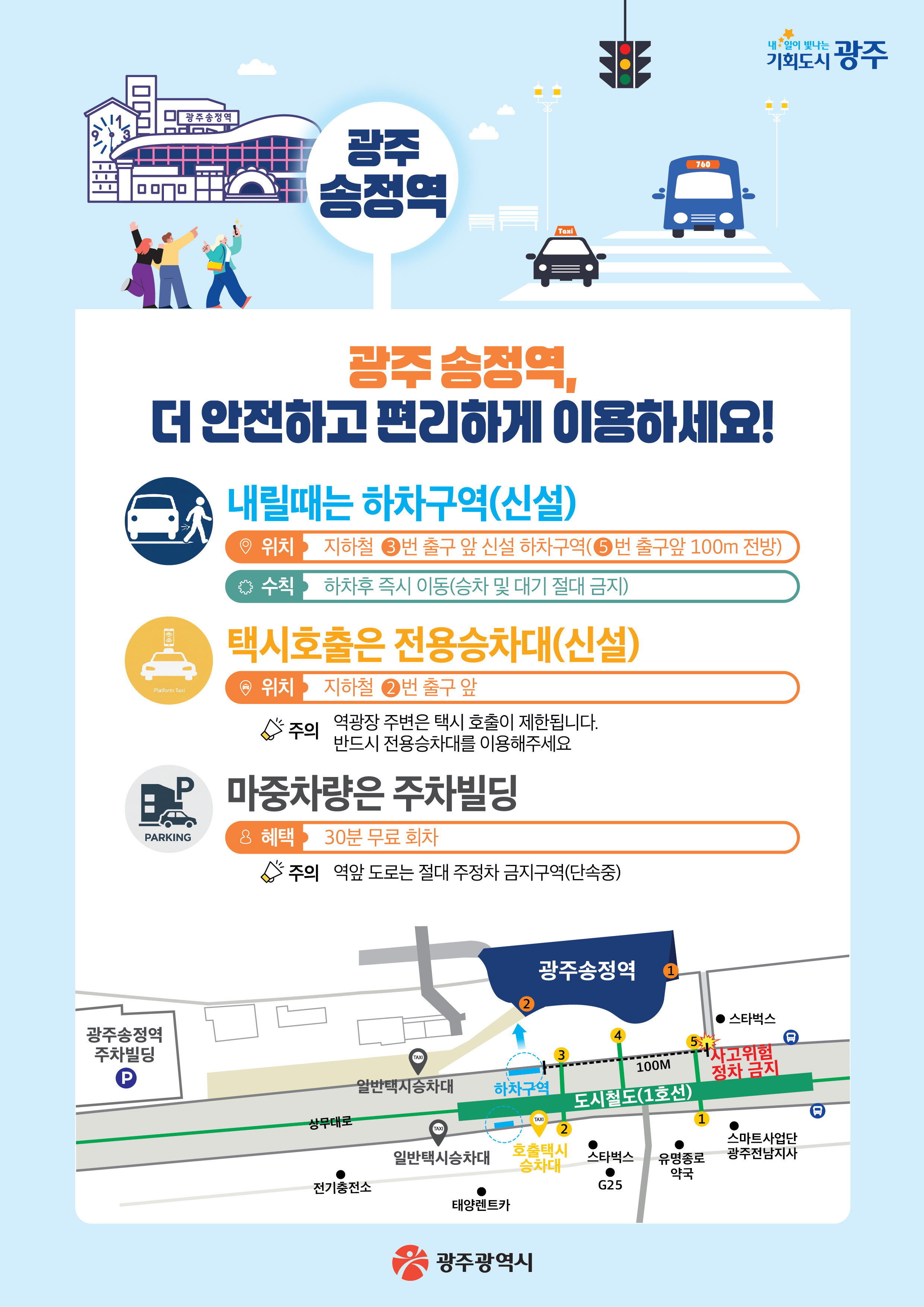광주시는 플랫폼 택시 이용 증가에 대응하기 위해 2번 출구(광주송정역 건너편) 앞에 ‘호출택시 승차대’를 신설했습니다.