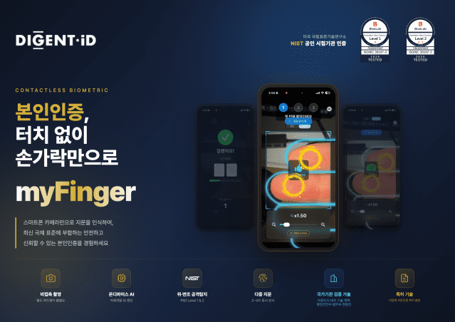 생체인증 기술기업 디젠트아이디(Digent ID, 대표 정도영)는 자사의 비접촉 지문인증 솔루션 ‘마이핑거(MyFinger)’가 국제 표준 ISO/IEC 30107-3 프레젠테이션 공격 탐지(Presentation Attack Detection, PAD) 시험에서 레벨 1 및 레벨 2 인증을 모두 획득했다고 9일 밝혔다. 회사는 “비접촉 지문인증 분야에서 국내 최초 성과”라고 설명했다.