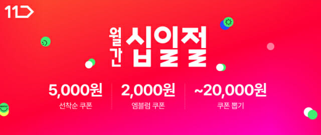 11번가는 행사 기간 전 고객을 대상으로 ‘5000원 할인 장바구니 쿠폰'(5만원 이상 구매 시)을 매일 오전 9시 선착순 발급하며, 십일절 엠블럼이 부착된 상품에 적용할 수 있는 ‘2000원 할인 장바구니 쿠폰'(2만원 이상 구매 시)을 매일 ID당 1장씩 발급한다. 또한 ‘행운의 쿠폰 뽑기’ 행사를 통해 모든 참여 고객에 최대 ‘2만원 할인 장바구니 쿠폰'(3만원 이상 구매 시)도 제공한다.