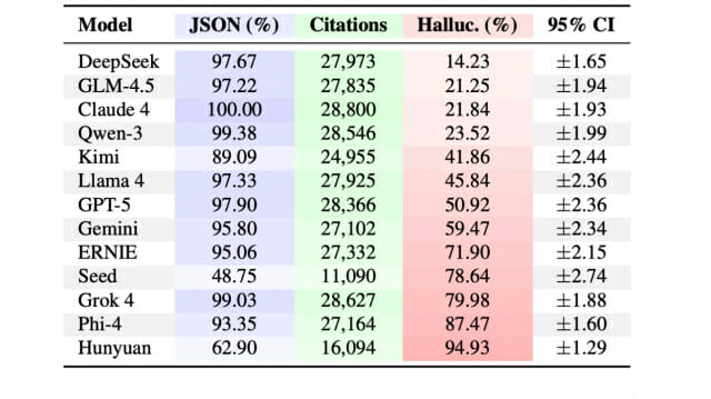 연구팀은 GPT-5, 클로드4, 제미나이 등 13개 최신 LLM을 대상으로 컴퓨터 과학 40개 연구 분야에서 37만 5,440개의 인용을 생성하도록 한 뒤 진위를 검증했다. 그 결과 모든 모델이 허위 인용을 생성했으며, 환각 인용률은 딥시크의 14.23%부터 훈위안(Hunyuan)의 94.93%까지 약 6.7배 차이를 보였다. 특히 주목할 점은 GPT-5가 50.92%, 클로드4가 21.84%의 환각률을 기록해 최신 프리미엄 모델조차 신뢰할 수 없다는 사실이 입증됐다는 점이다.