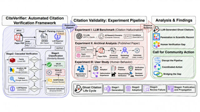 연구팀은 2020년부터 2025년까지 NeurIPS, ICML, IEEE S&P 등 최상위 AI/ML 및 보안 학회에 발표된 5만 6,381편의 논문에서 220만 개의 인용을 검증했다. 자동 검증 후 의심스러운 2,530개 인용을 16명의 연구진이 약 한 달간 수작업으로 재검증한 결과, 604편(1.07%)의 논문에서 739개의 확실한 허위 인용을 발견했다. 이 중 486편(0.86%)은 추적 불가능한 유령 인용을, 133편(0.24%)은 메타데이터 오류를 포함하고 있었다.