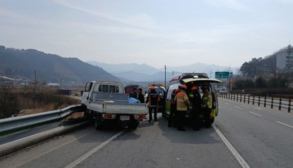 이 사고로 트럭에 타고 있던 동승자 A(50대·여)씨가 골절상을 입고 병원으로 옮겨졌다. 또 경차와 트럭에 타고 있던 탑승자 3명도 경상을 입었다.