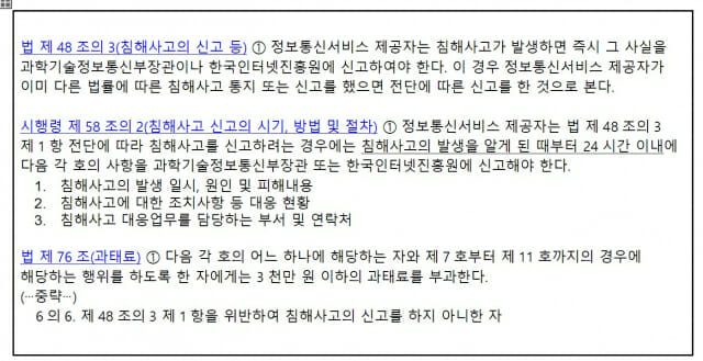 정보통신망법에서는 정보통신서비스 제공자(온라인서비스 제공자)는 침해사고가 발생한 것을 알게 된 때부터 24시간 이내 과학기술정보통신부장관이나 한국인터넷진흥원에 신고해야 하는데, 일부 업체가 이를 위반한 것이 문제가 됐다. (참고로, 정보통신망법의 침해사고 관련 규정은 정보통신서비스 제공자에 적용되는데, 영리 목적으로 홈페이지나 SNS만 이용해도 정보통신서비스 제공자에 해당해 적용 대상이 많다. 아래 이미지 참조)