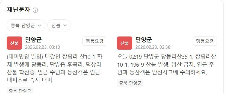 강한 바람에 불이 확산하자, 단양군은 오전 3시 13분 당동리와 단양읍 후곡리, 덕상리 인근 주민과 등산객에게 대피하라는 재난문자를 발송했습니다.