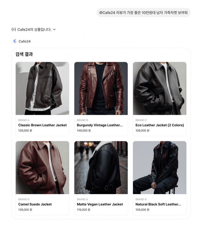 검색 방식도 다양하다. “@cafe24, 요즘 유행하는 20만원대 선글라스가 뭐야?”처럼 트렌드 기반 검색은 물론, “@cafe24, ○○쇼핑몰에서 가장 리뷰가 좋은 레깅스 보여줘”처럼 특정 쇼핑몰을 지정한 검색도 가능하다. “@cafe24, 20대 여성이 사용할, 최근 인기 많은 겨울장갑 추천해줘”처럼 타깃 고객층을 특정해 요청할 수도 있다.