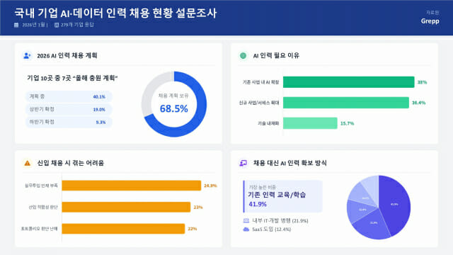 그렙(대표 임성수)이 국내 기업을 대상으로 실시한 ‘AI·데이터 인력 채용 인식 조사’ 결과에 따르면, 응답 기업의 68.5%가 올해 AI 인력 충원 계획이 있다고 밝혔다.