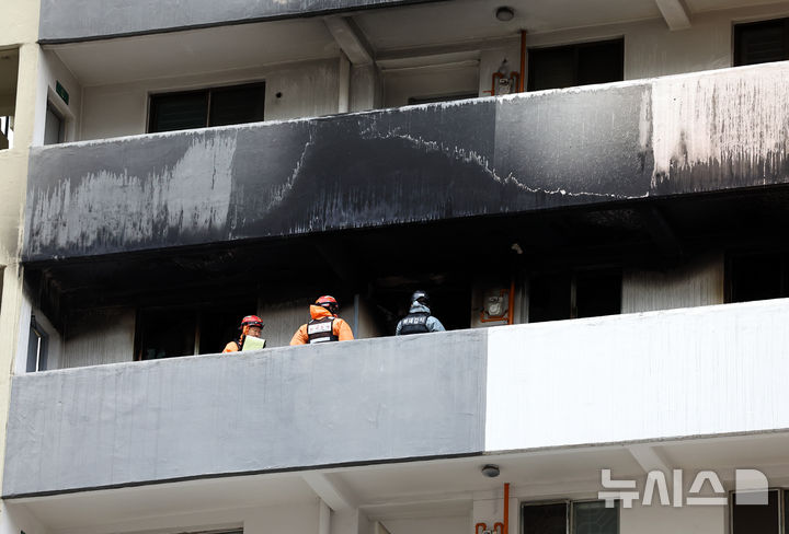 이날 오전 뉴시스가 찾은 화재 시작점인 아파트 8층 현장은 외부로 향하는 베란다 창문이 절반 이상 깨져 검게 그을린 내부가 훤히 들여다보였다.