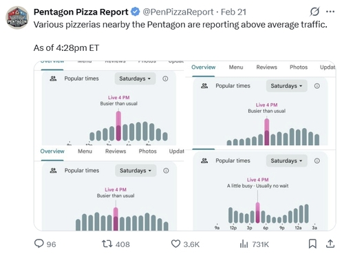 2024년 8월에 활성화된 이 계정은 구글 지도의 ‘인기 시간대’ 기능을 활용해 국방부 주변 피자집이 평소보다 바쁜지 주시합니다.