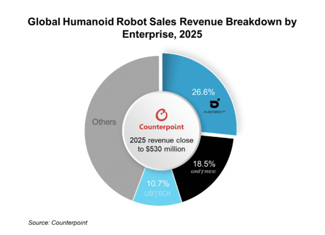 27일 시장조사업체 카운터포인트리서치에 따르면 작년 휴머노이드 로봇 상업적 도입이 가속화되며 매출과 출하량 모두 상위 기업 중심으로 시장이 재편됐다. 글로벌 매출 약 56%를 상위 3개 기업이 차지했으며 이들 모두 중국 기업인 것으로 나타났다.