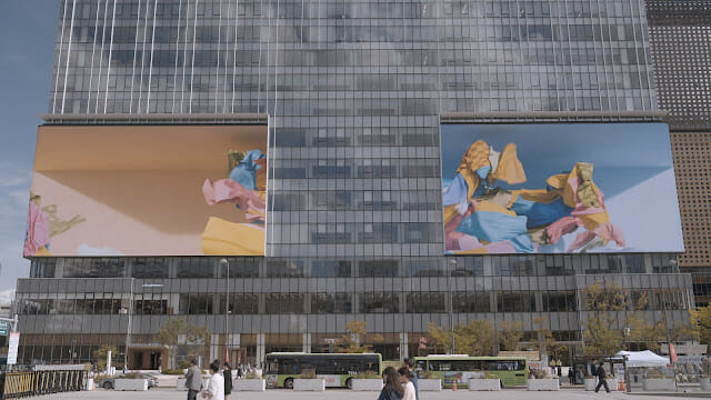 영상엔 KT스퀘어의 듀얼 스크린을 활용해 역동적이고 흥겨운 춤사위를 통해 소통과 융합의 메시지를 담아냈다. 특히 아나모픽 3D 효과를 적용해 공간의 깊이감을 극대화함으로써 높은 몰입감을 구현했다.