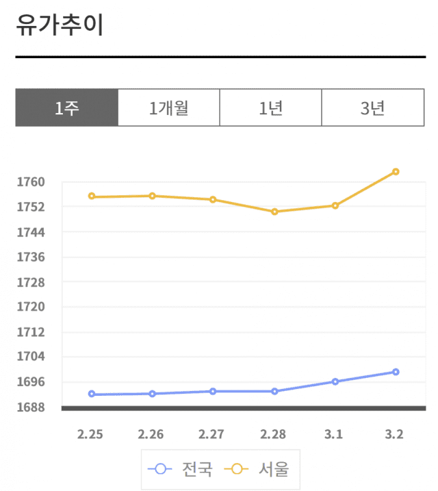 같은 기간 서울 기름값은 가파르게 올랐다. 지난 달 28일 1750원이었던 서울 지역 평균 기름값은 1750원이었으나 1일 1752원, 2일은 1763원으로 이틀새 13원 상승했다.