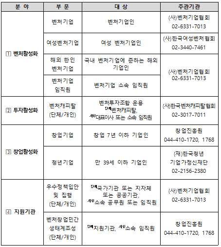 ‘벤처창업진흥 유공’ 포상은 1997년부터 매년 이어져 온 정부 차원의 대표 포상이다. 벤처․창업기업과 투자자, 지원기관 종사자의 사기를 진작하고 도전과 혁신의 문화를 확산하기 위해 마련됐다. 올해는 오는 5일 접수를 시작으로 서류․현장심사 등을 거쳐 연말에 있을 벤처주간 행사에서 시상한다.