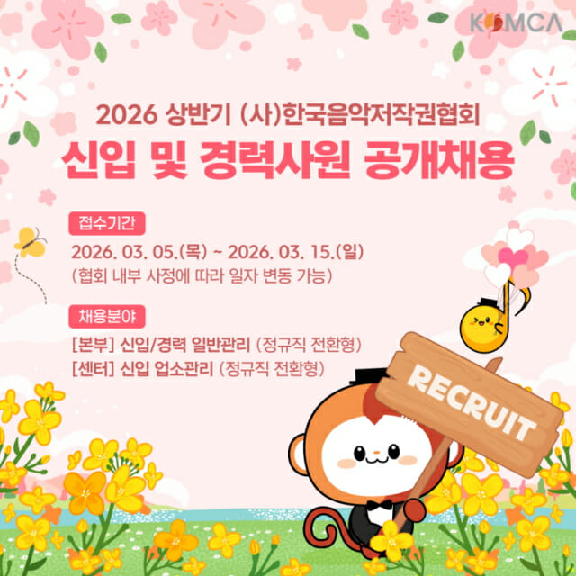 사단법인 한국음악저작권협회(회장 이시하, 이하 음저협)가 3월 5일부터 15일까지 2026년도 상반기 신입 및 경력사원 공개채용을 실시한다.