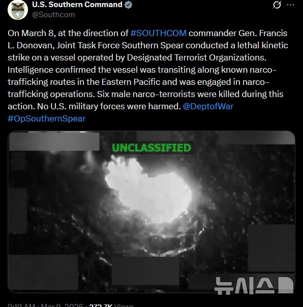 남부사령부는 소셜미디어 엑스(X·옛 트위터) 계정에서 “합동임무부대 ‘서던 스피어(Southern Spear)가 지정 테러 단체가 운영하는 선박에 대해 치명적인 물리적 타격을 수행했다”고 밝혔다.