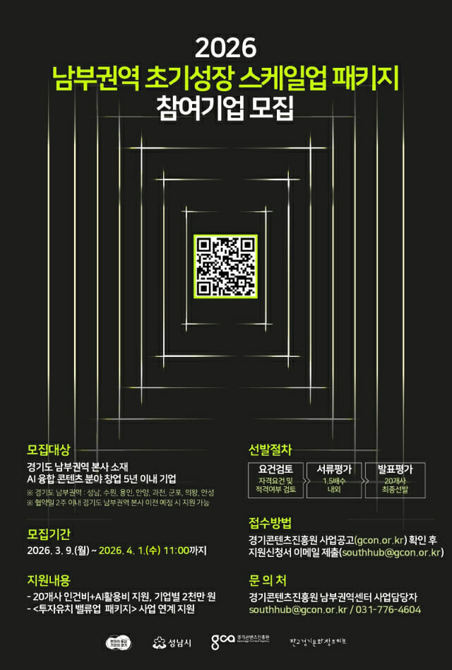 경콘진은 다음 달 1일까지 ‘남부권역 초기성장 스케일업 패키지’에 동참할 20개 기업을 모집한다고 9일 밝혔다.