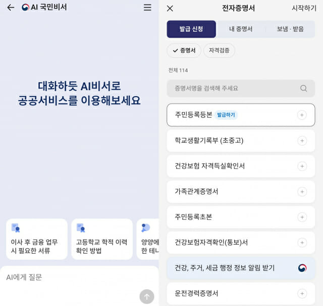 AI 국민비서는 주민등록등본 뿐만 아니라 고등학교 학적 이력 확인 방법, 이사 후 금융 업무 시 필요 서류 등에 관한 정보도 제공해준다.