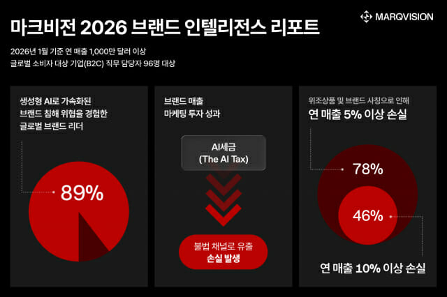9일 마크비전이 발간한 ‘2026 브랜드 인텔리전스 리포트(2026 State of Brand Integrity Report)’에 따르면 글로벌 브랜드 리더 89%가 생성형 AI로 가속화된 브랜드 침해 위협을 이미 경험한 것으로 조사됐다. 이는 브랜드가 매출을 올리거나 마케팅에 투자할 때마다 그 성과 일부가 불법 채널로 빠져나가며 반복적으로 손실이 발생하는 구조적 문제로, 마크비전은 이를 ‘AI 세금(The AI Tax)’으로 규정했다.