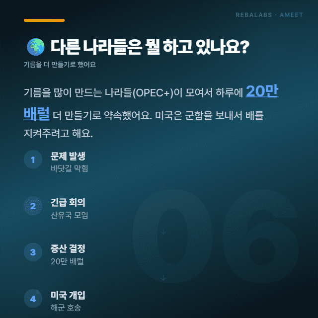 기름이 비싸지면 운송비가 오르고, 그러면 우리가 쓰는 모든 물건 값이 함께 올라가는 구조예요. 다행히 세계 각국이 해결책을 찾고 있어요. 기름을 많이 생산하는 OPEC+ 국가들이 긴급 회의를 열어 하루 20만 배럴을 추가로 생산하기로 약속했고, 미국은 군대 함정을 보내 기름 수송선을 보호하고 있어요.