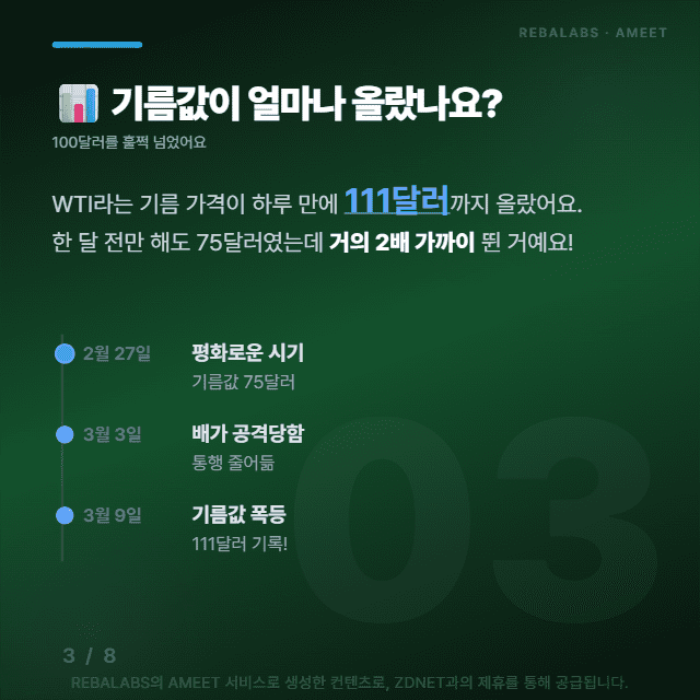 이 해협은 전 세계 기름배의 70%가 지나가는 아주 중요한 길인데, 지금은 거의 통과하지 못하고 있는 상황이에요. 그 결과 국제 유가가 급등했는데요, WTI라는 기준으로 보면 한 달 전만 해도 75달러였던 기름값이 하루 만에 111달러까지 치솟았어요. 거의 2배 가까이 뛴 셈이죠.
