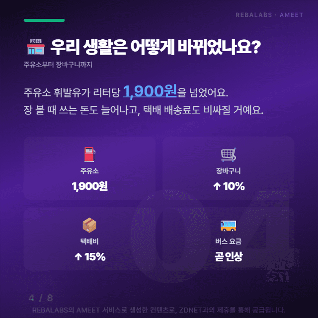 이런 변화는 바로 우리 일상으로 이어져서, 주유소 휘발유가 리터당 1,900원을 넘어섰고, 장바구니 물가는 10%, 택배 배송료는 15%나 올랐어요. 버스 요금도 곧 인상될 예정이라고 하네요.