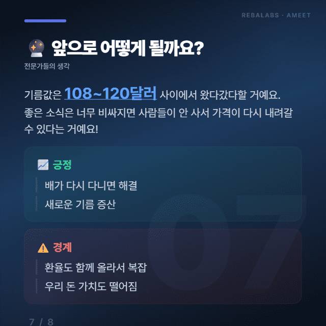 전문가들은 유가가 108~120달러 사이에서 움직일 거라고 예상하는데요, 너무 비싸지면 수요가 줄어 자연스럽게 가격이 조정될 수 있다는 희망적인 전망도 내놨어요. 어려운 시기지만 우리 모두 에너지를 아껴 쓰면 조금씩 나아질 수 있을 거예요.