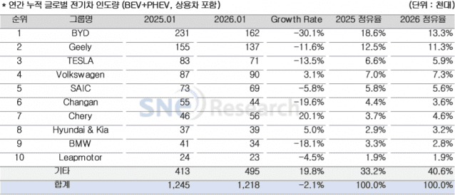 SNE리서치 관계자는 “1월 글로벌 전기차 시장은 단기 역성장을 기록했으나, 이는 시장 위축이라기보다는 정책 기조 변화와 성장 속도 조정이 맞물린 일시적 조정 흐름”이라며 “중국은 구매세 감면 체계 전환과 내수 보급률 상승 영향으로 성장 속도가 완만해지고 있으며, 유럽은 규제 기반 수요를 바탕으로 비교적 안정적인 확장 흐름을 이어가고 있다”고 분석했다.