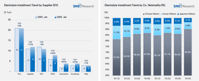 국적별 점유율 기준으로는 중국 기업들이 전해액 시장 내 우위를 유지하고 있다. 2025년 4분기 기준 중국 기업 점유율은 90.5%로 집계됐다. 한국과 일본 기업은 각각 5.8%, 3.7%를 기록했다. 전년 동기 대비 소폭 감소한 수치로, 중국 업체 중심의 공급 구조가 강화되는 흐름이다.