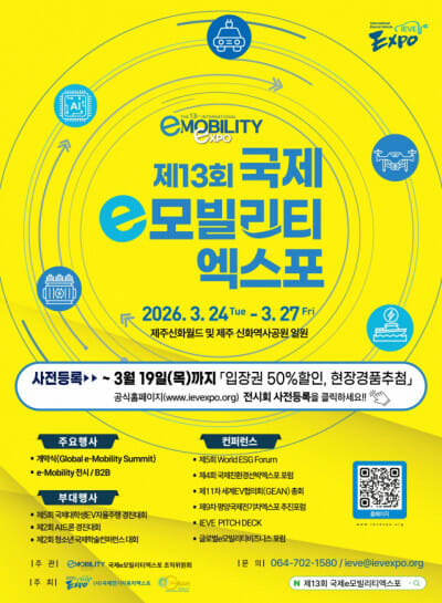 제13회 국제 e모빌리티엑스포(IEVE 2026)가 오는 3월 24일부터 27일까지 나흘간 제주 신화월드 일대에서 열린다.