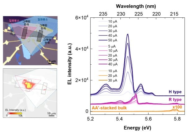 연구팀은 단순한 광학적 관측에 그치지 않고, 실제로 전기를 흘려 빛을 내는 LED 소자를 제작했다. 그래핀을 전극으로 사용하여 터널링 방식으로 전하를 주입한 결과, 10μA 정도의 전류에서 선명한 심자외선 발광이 관측됐다.