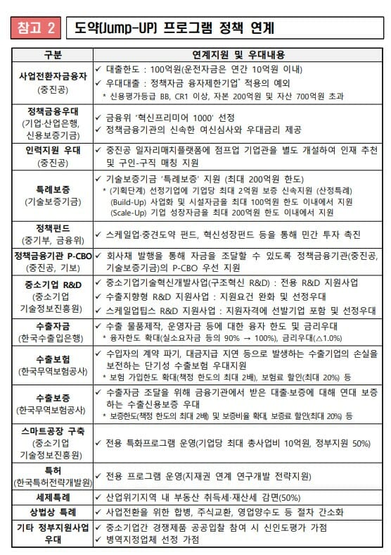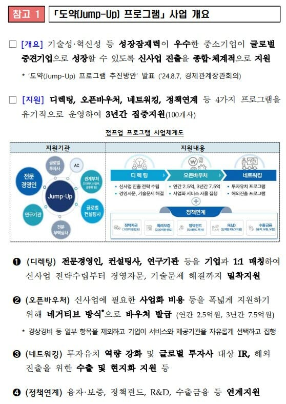 ‘도약(Jump-Up) 프로그램’은 우수한 성장성, 기술성 등을 보유한 업력 7년 이상의 중기업이 신사업·신시장 진출을 통해 새로운 성장동력을 확보하고 중견기업으로 도약할 수 있게 지원하는 제도다. 작년에 이어 올해가 2기다. 현정부 국정과제(35번)로 추진 중이며 매년 100개씩 선정해 2029년까지 총 500개사를 선발할 계획이다.