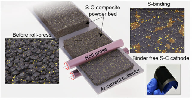 연구팀은 열 받으면 부드러워지고 잘 달라붙는 황에 주목했다. 알루미늄 포일 집전체 위에 황-탄소 복합 분말층을 만들고, 열을 가한 뒤 강한 압력으로 누르는 ‘열-보조 건식 프레싱’ 공정으로 별도 바인더 없이도 전극이 형성되는 것을 확인했다. 황을 활물질과 바인더로 이중 활용하는 방식이다.