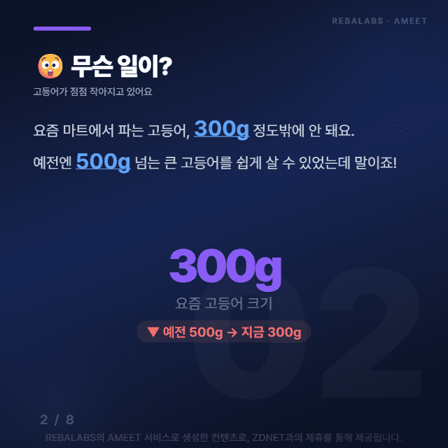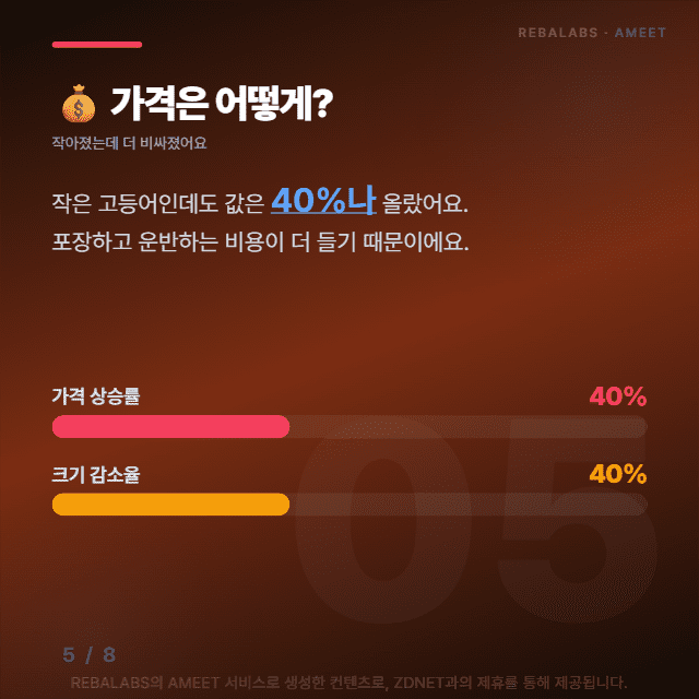 작은 고등어인데도 가격은 오히려 40%나 올랐거든요. 포장하고 운반하는 비용이 더 들기 때문이래요. 하지만 다행히 작아졌다고 해서 영양까지 줄어든 건 아니에요!