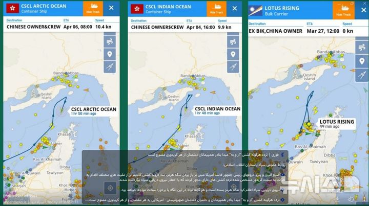 이들 선박은 중국 국영 해운사 코스코(COSCO·중국원양해운) 소속 컨테이너선 아크틱오션호(홍콩 선적)와 인디언오션호(홍콩 선적), 마셜제도 선적 벌크선 로터스라이징호다. 이들은 모두 선박자동식별장치(AIS)에 ‘중국 선주와 선원’이라는 메시지를 남겼지만 통항이 거부됐다.