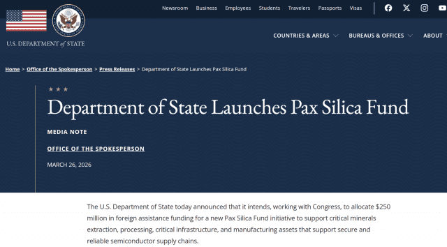 미국 국무부가 자국 내 반도체 공급망 강화를 위한 ‘팍스 실리카(Pax silica)’ 펀드를 출범한다고 26일(현지시간) 발표했다.